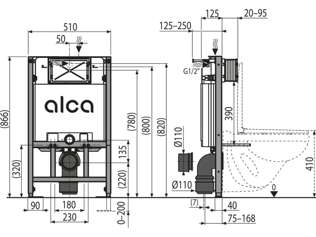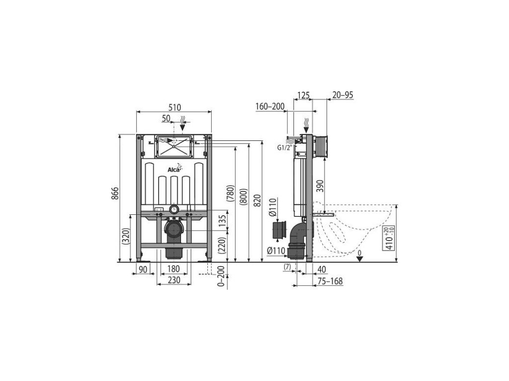 - Pro montáž závěsného WC s připojovací roztečí 180 mm nebo 230 mm