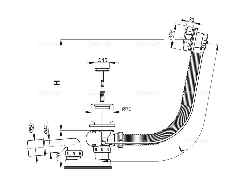 Alcaplast A55K vanový sifon automat s bovdenem komplet kov