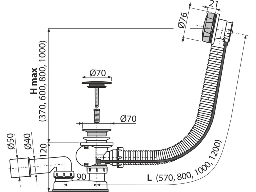 Alcaplast A55KM vanový sifon automat s bovdenem komplet kov