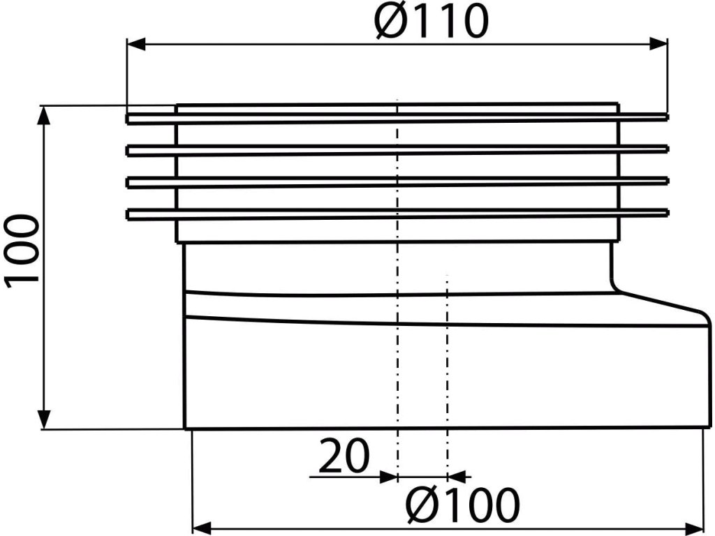 WC manžeta k volně stojícímu WC, excentrická 20 mm, 90–110 mm, délka 100 mm, PVC, bílé