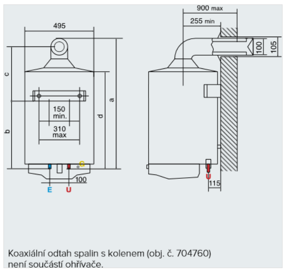 - Koaxiální odtah spalin, vnější průměr 100 mm, max. délka 900 mm