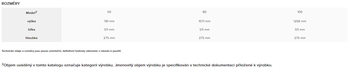 - Skutečný vnitřní objem 45, 65 nebo 80 litrů nahradí klasický zásobník s objemem 50, 80 nebo 100 litrů