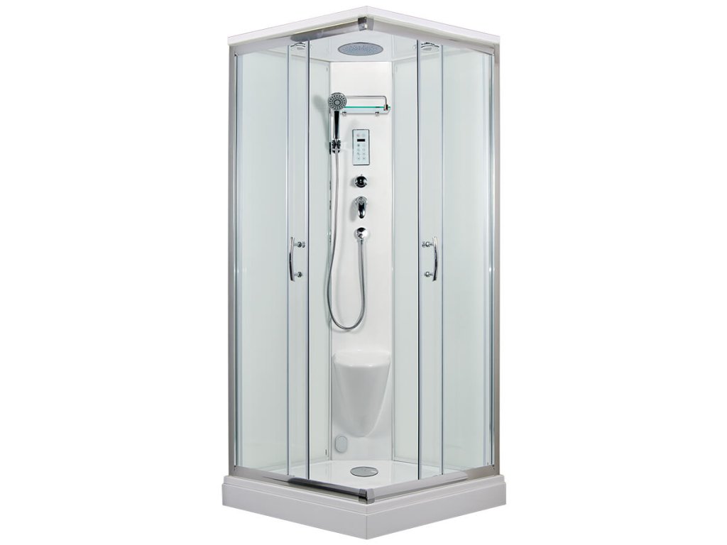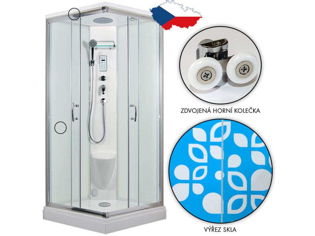 Parní sprchový box vlastní výroby s posuvnými dveřmi čtvercový se vyznačuje jednoduchým designem, vysokou kvalitou zpracování. Profil je z leštěného hliníku, prosklení z 5 mm bezpečnostního čirého skla, zadní sklo super bílé neprůhledné, šířka vstupu 48 cm. Vanička je z litého mramoru, vlastní výroby, v bílé barvě. Výroba panelu, předního panelu k vaničce a stropu je nyní z kompozitních materiálů, které se používají v leteckém průmyslu. Vůči dříve používané polyesterové pryskyřici je kompozitní materiál ekologičtější, lépe zpracovatelný a při stejné tloušťce výrobku pevnější. Je to také důvod, proč můžeme dosáhnout tak dokonalé povrchové úpravy.