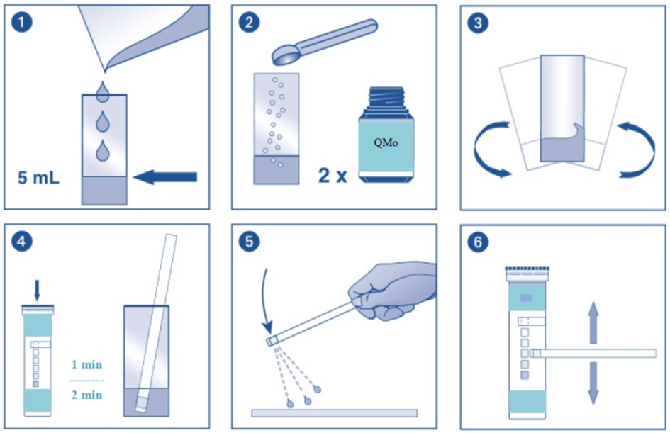 - do testované vody přidejte 2 odměrky reagencie QMo