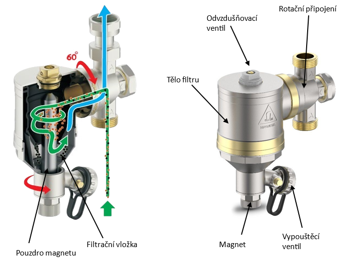 Magnetický mechanický filtr s rotačním připojením pro ochranu komponent topných systémů s kotli a tepelnými čerpadly před poškozením nečistotami, které se vytvoří během provozu systému, nebo před tvorbou nežádoucích usazenin z nekvalitní provozní kapaliny.