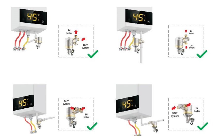 - Doporučujeme jej umístit na zpětné potrubí, přivádějící vodu z topení do kotle či tepelného čerpadla. Tímto bude zajištěno, že veškeré nečistoty ze systému budou zachyceny ve filtru před vstupem vody do instalovaného zařízení.