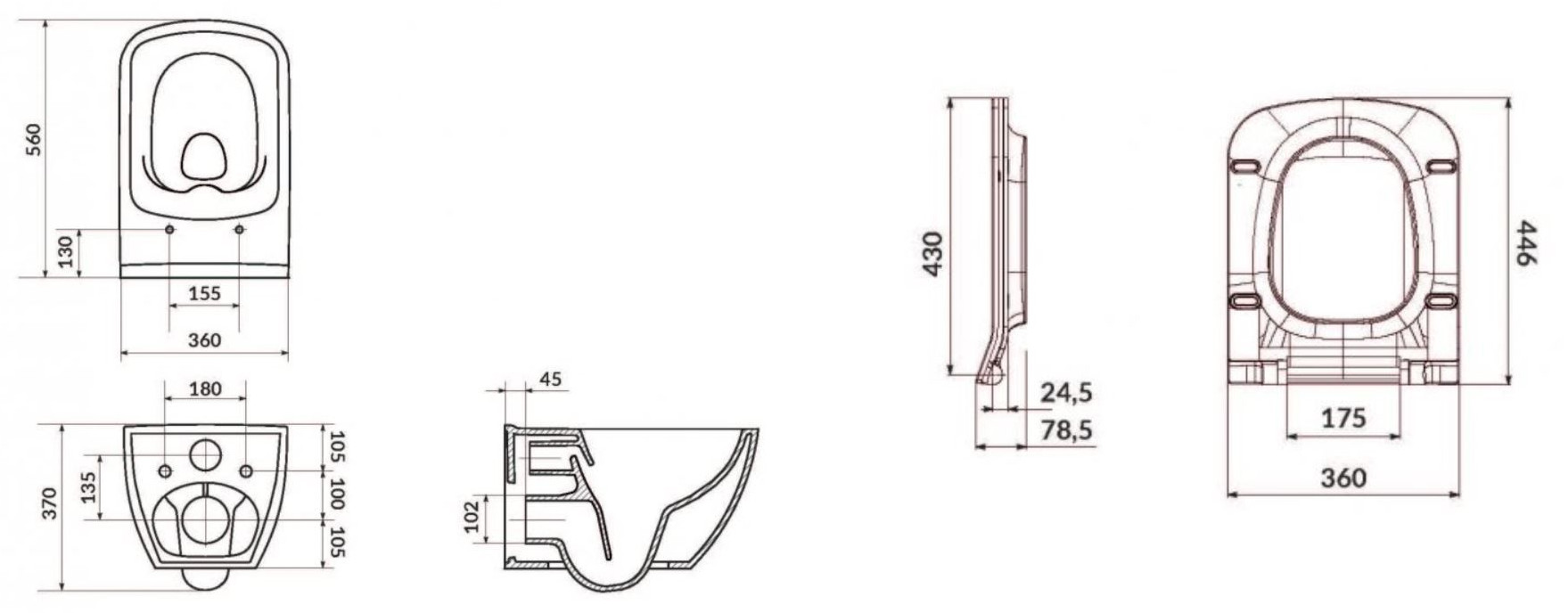 Lakovaná MDF.Úchyty chromovaná mosaz.Rozměr 44.5±2 x 37.5 cm.Rozteč 110 - 180 mm.Váha sedátka 3,1 kg.
