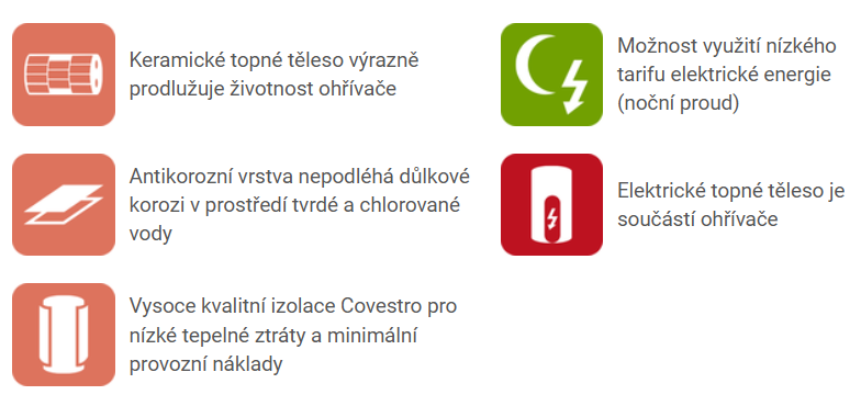 Ohřev zajišťuje keramické topné těleso s pevným výkonem ovládané provozním termostatem a jištěné bezpečnostním termostatem (tepelnou pojistkou)