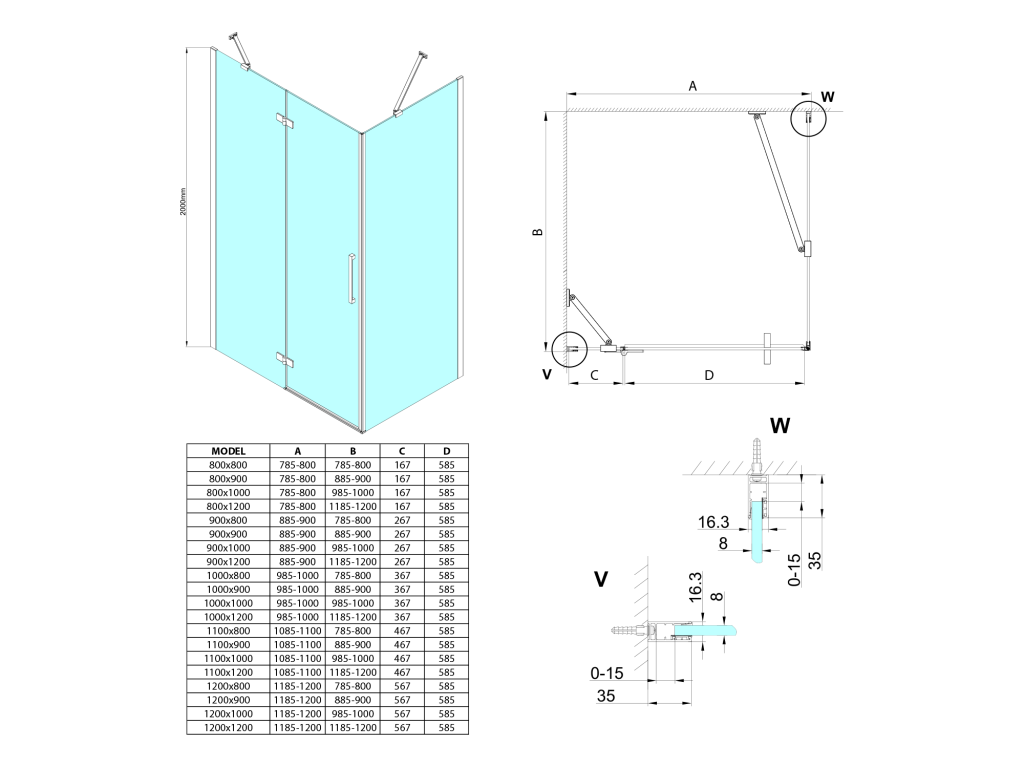 - Zkracovatelné rohové vzpěry, které lze přizpůsobit pro rozměr zástěny