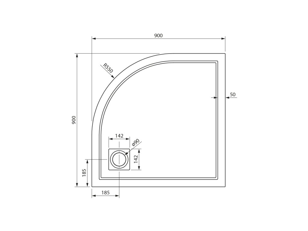 Čtvrtkruhová sprchová vanička z materiálu SMC, výška 14 cm, včetně nožiček a sifonu o 90 mm