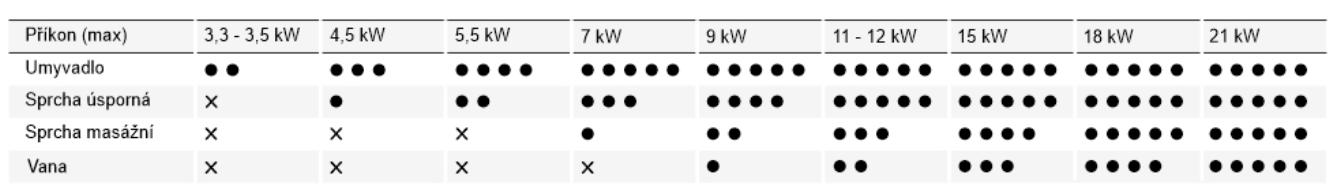 Pro snazší výběr vhodného modelu průtokového ohřívače vody výrobce připravil přehlednou tabulku vhodnosti použití. Seřazena je dle příkonu a typu využití - náročnosti na spotřebu množství vody. Elektrické průtokové ohřívače vody i přes vyšší příkony dosahují vysoké finanční úspory, vzhledem k tomu, že nemají zabudovaný zásobník. Na rozdíl od zásobníkových ohřívačů zahřejí neomezené množství vody. Vodu zahřívají průběžně, což znamená, že zvyšováním průtoku se snižuje teplota ohřáté vody.