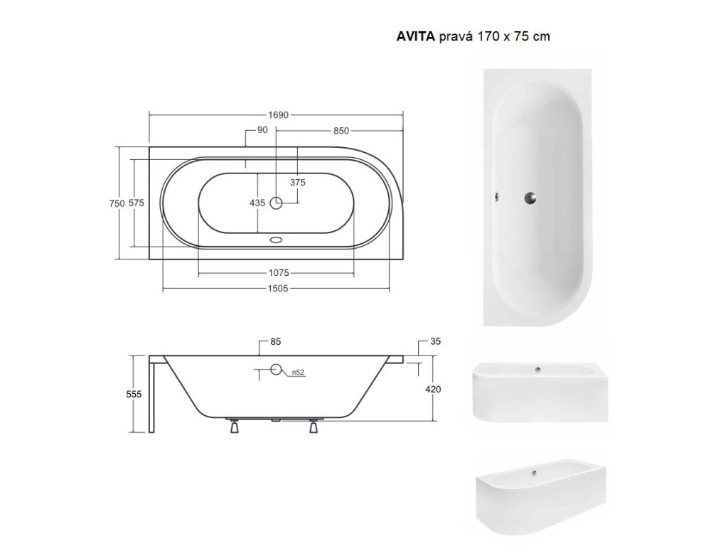 - 1600 × 750 mm (170 l) (levá / pravá varianta)