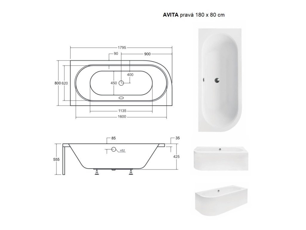 - 1800 × 800 mm (215 l) (levá / pravá varianta)