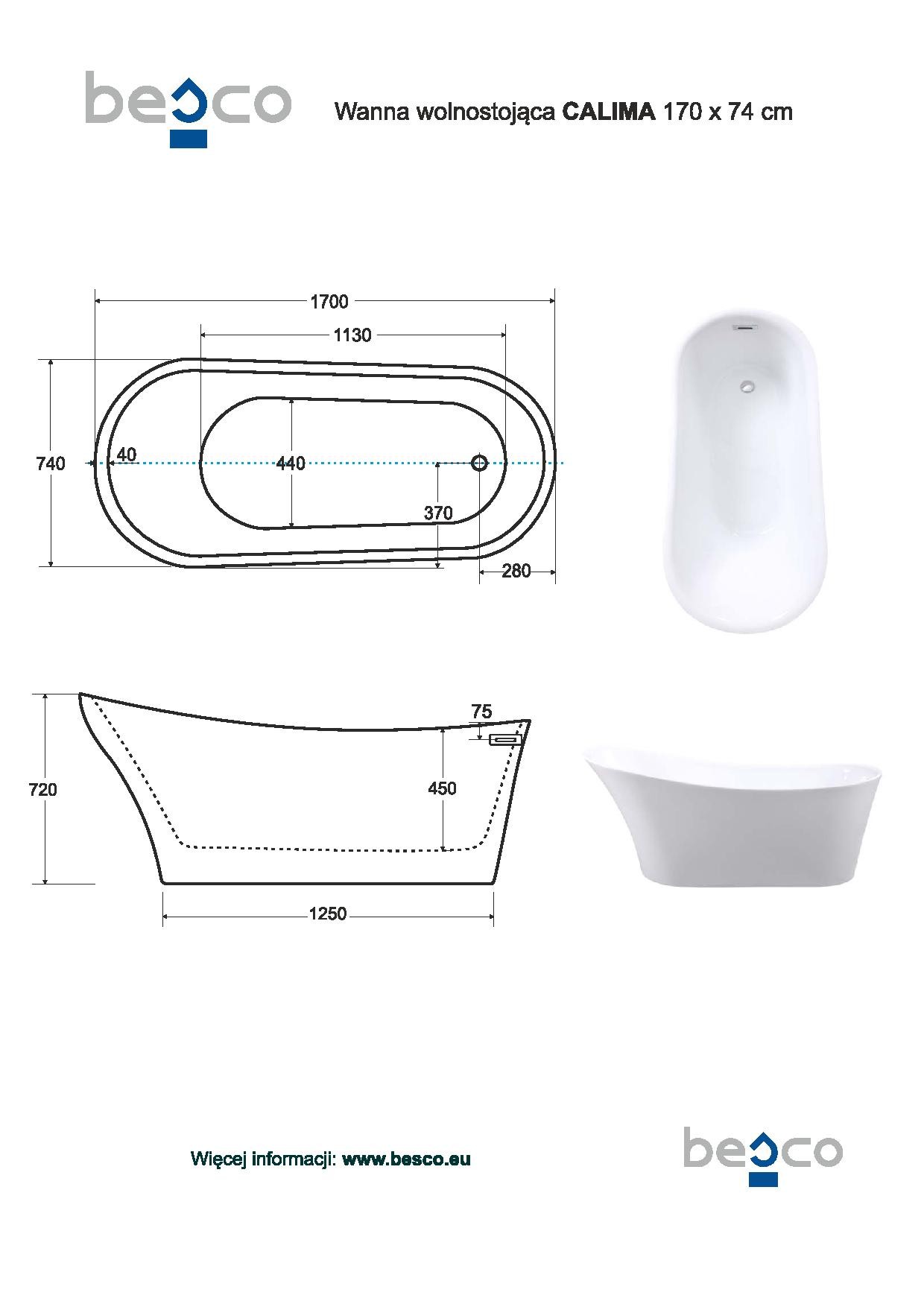 Besco Calima vana volně stojící 170 x 74 cm černý sifon akrylát bílá VANCALIM170B