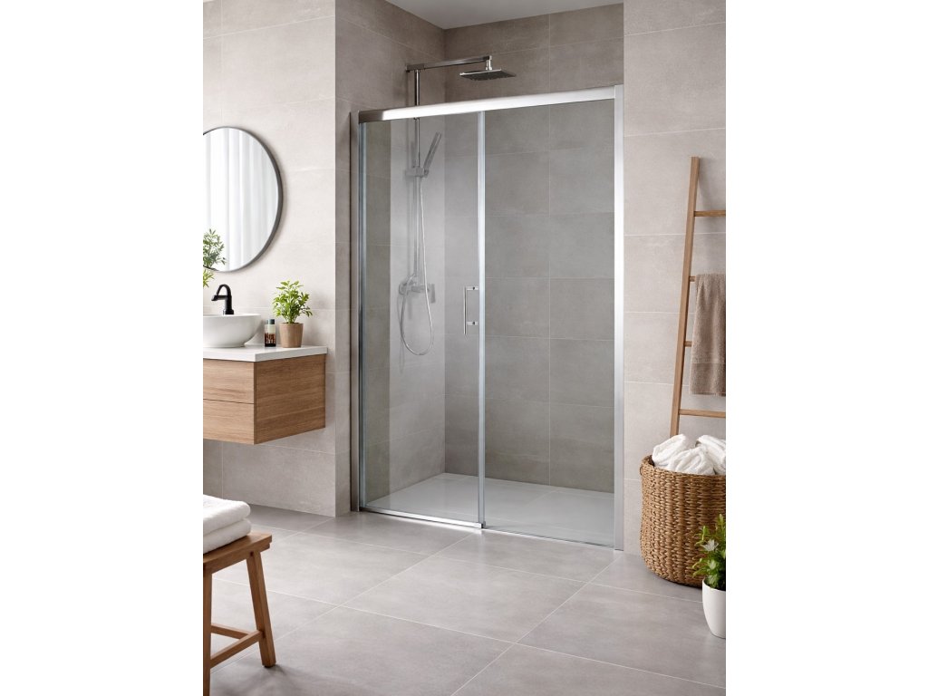 Skleněné posuvné dveře Estrela od firmy Hopa řeší atypické vstupy v prostorných koupelnách. Díky absenci spodního vodícího profilu, vzniká bezbariérový vstup do sprchy.