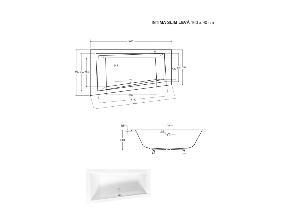 - 1600 × 900 mm (205 l) (levá / pravá varianta)