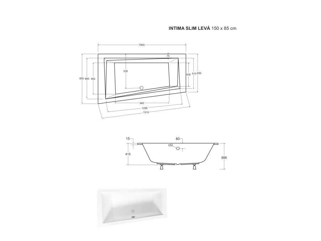 - 1500 × 850 mm (190 l) (levá / pravá varianta)
