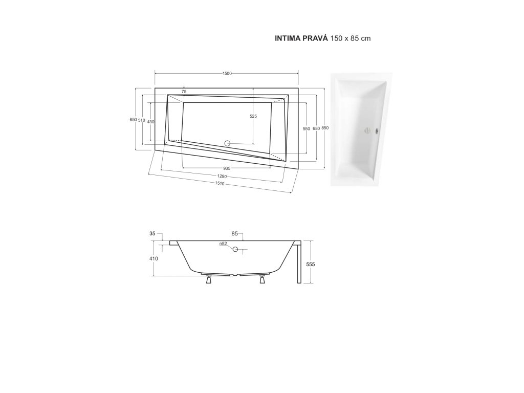 - 150 × 85 cm (190 l) (levá / pravá varianta)