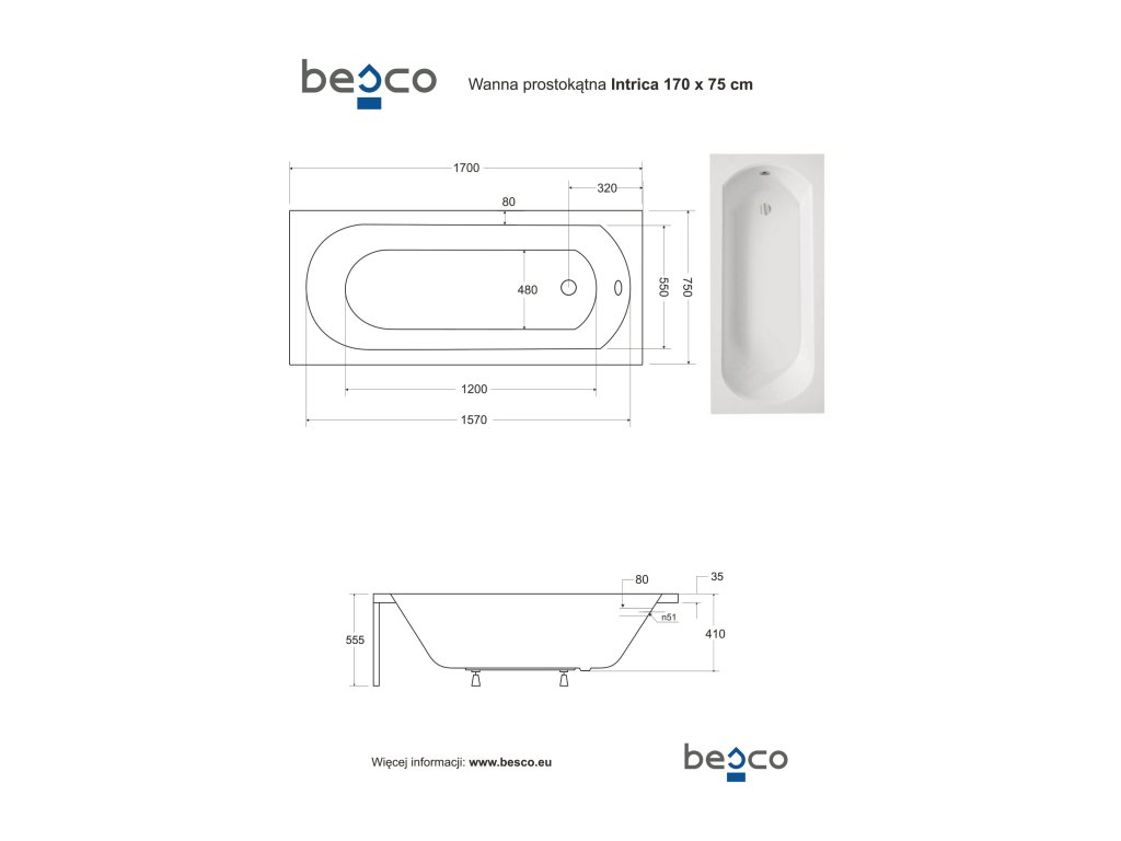 - 1700 × 750 mm (190 l)