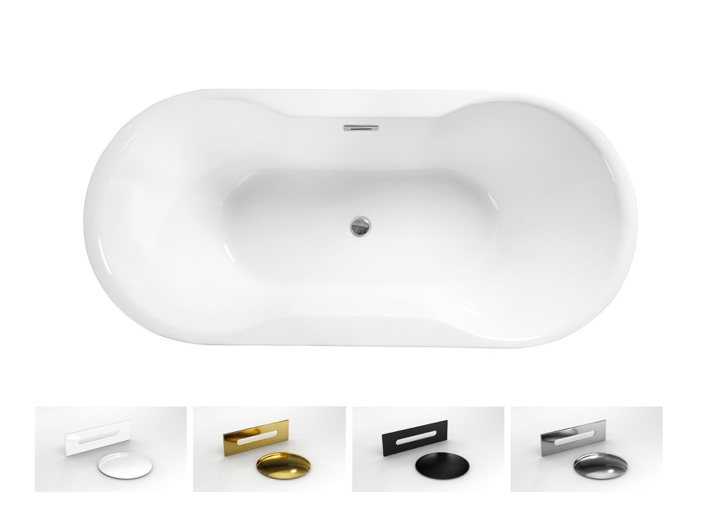 Součástí vany je i odtoková souprava click-clack s přepadem v barvách: