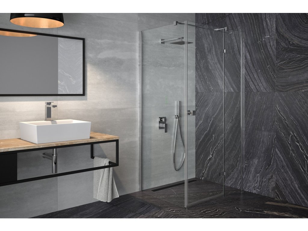 Čtvercový bezrámový sprchový kout Pixa se skládá z pevných skel a zalamovacích dveří, které se otevírají do prostoru. Spodní strana je opatřena okapničkou, díky níž voda ze skla při otevření nezteče do prostoru koupelny.