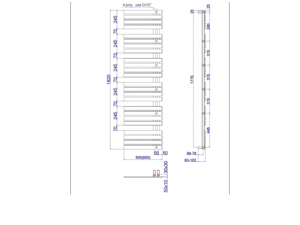 - 500 × 1820 mm, výkon 650 W, topná tyč 600 W