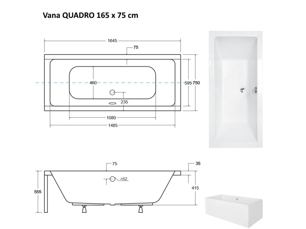 Obdélníková vana QUADRO vyniká vysoce kvalitním zpracováním a spolehlivou funkčností všech součástí a materiálů. Nožičky k vaně je nutné dokoupit - rádi Vám naceníme.