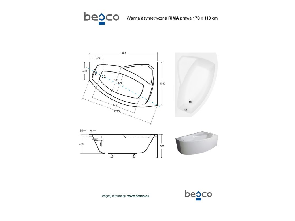 Besco RIMA 170 x 110 cm VANRIM170P+OLVPINOZSTELWD vana včetně nožiček pravá
