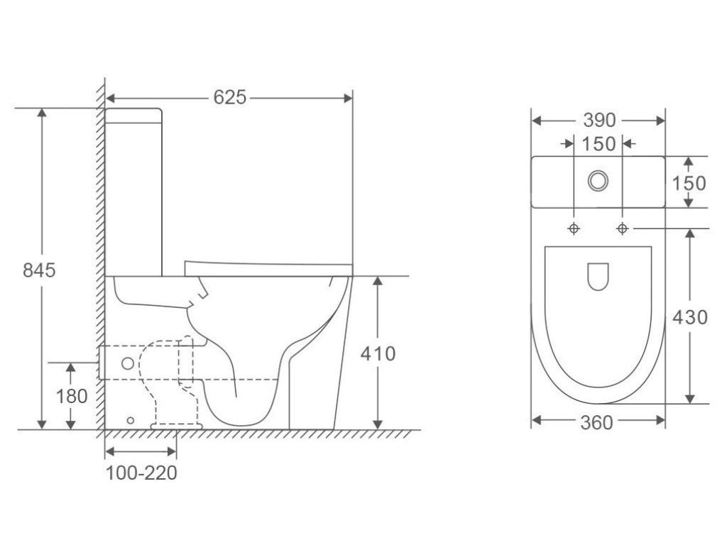 WC kombi se zadním odpadem s armaturou s úsporným splachováním, včetně plastového sedátka.