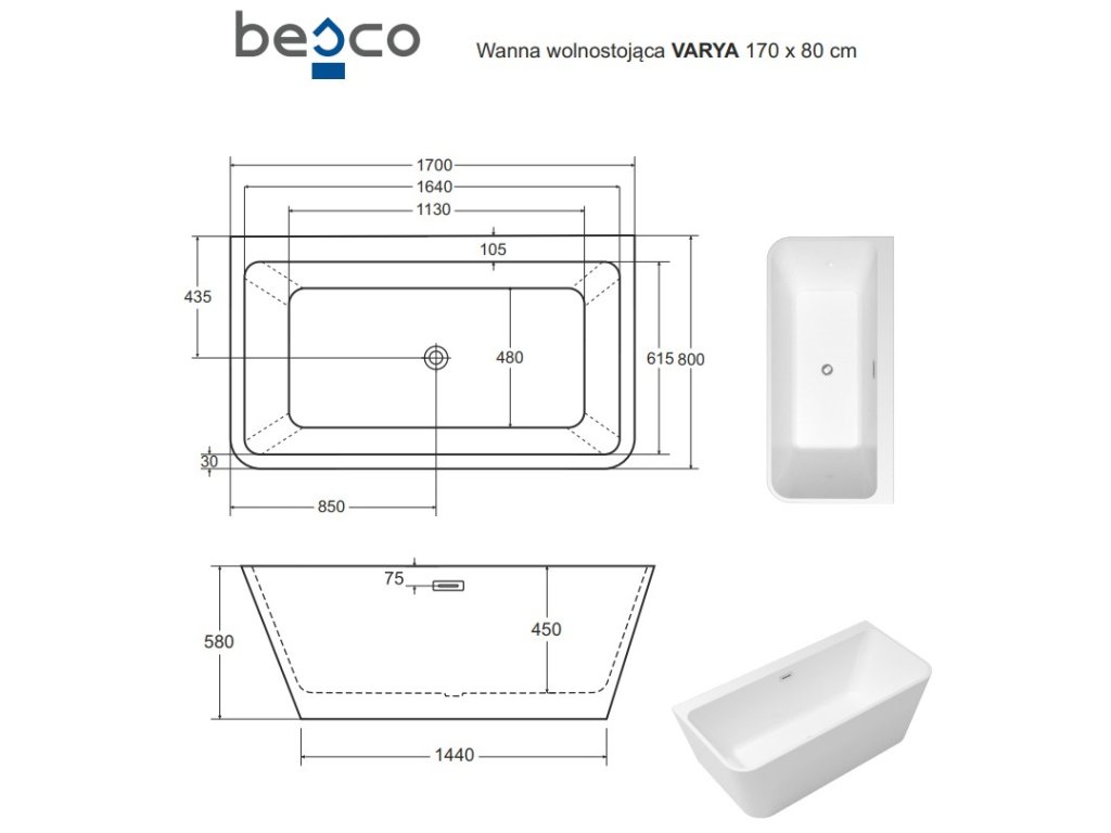 Besco Varya volně stojící vana 170 x 80 cm grafitový sifon akrylát bílá VANVARYA170G