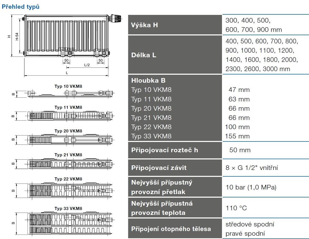 Model RADIK VKM8 je deskové otopné těleso v provedení VENTIL KOMPAKT, které umožňuje spodní středové nebo pravé spodní připojení na otopnou soustavu. Typy 20, 21, 22 a 33 mají jednotnou vzdálenost spodního středového připojení od stěny. Ze zadní strany jsou přivařeny dvě horní a dolní příchytky, otopná tělesa o délce 1800 mm a delší mají navařených šest příchytek. Desková otopná tělesa RADIK VKM8 jsou svou konstrukcí určena pro moderně řešené otopné soustavy s nuceným oběhem teplonosné látky a horizontálně vedeným rozvodným potrubím pod otopným tělesem v podlaze, ve stěně nebo po stěně zakryté lištou.