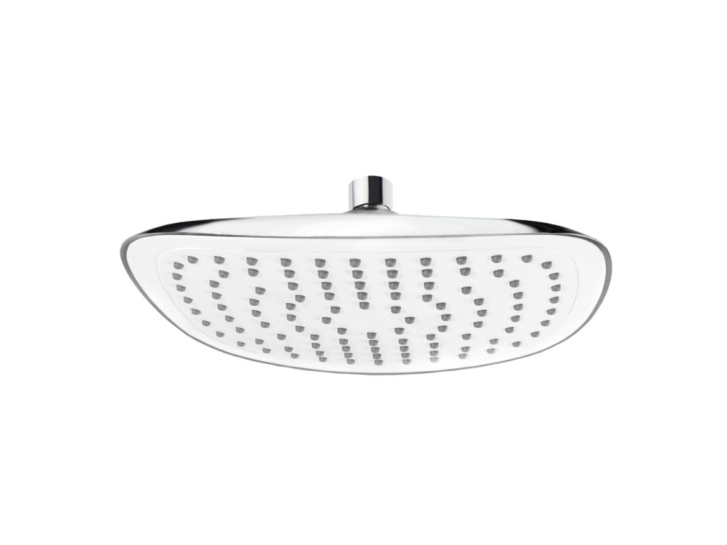 Dvoucestná podomítková baterie s keramickým přepínačem, Mbox, oválný kryt, vývod s držákem sprchy, rameno ze zdi 330 mm, talířová oválná sprcha 230x180 mm bílá/chrom, šedostříbrná hadice 150 cm, jednopolohová ruční sprcha.