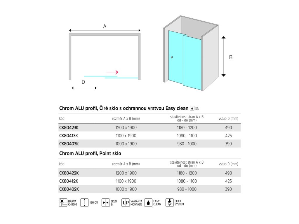 Hliníkové profily v barvě chrom, sklo Point, síla skla 6 mm, rozměr 80cm, výška 1900 mm.