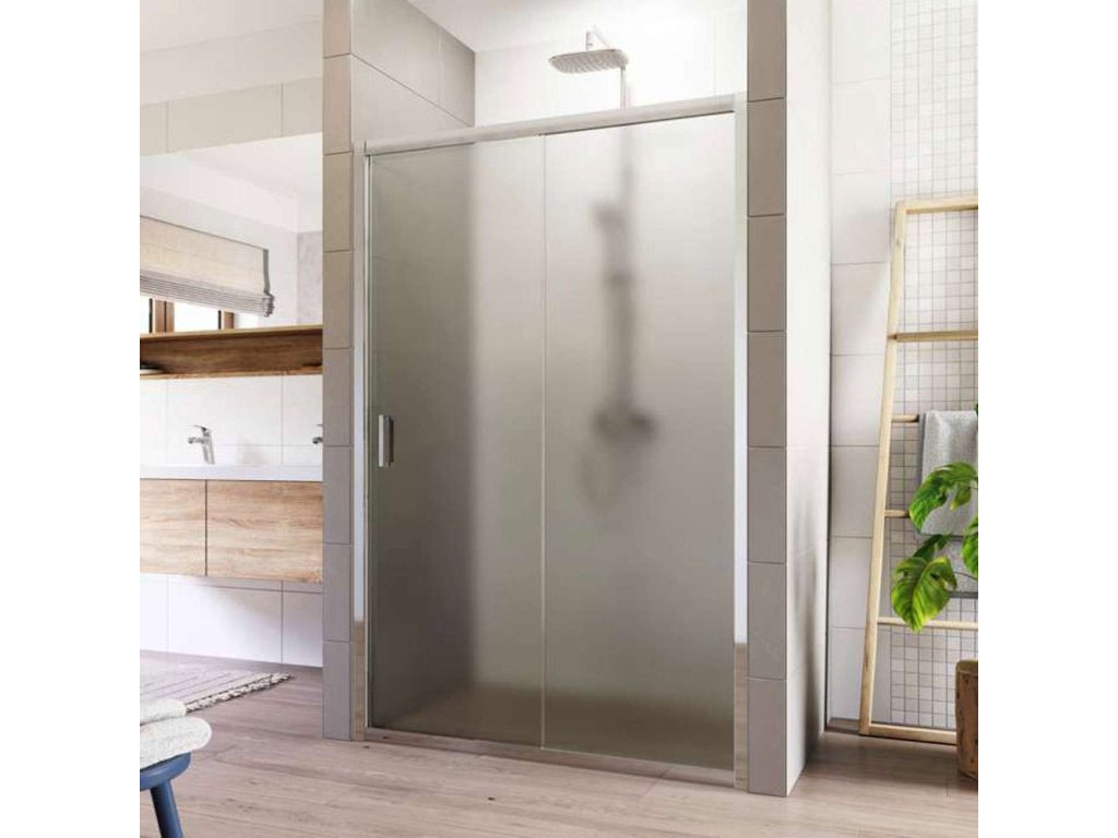 Hliníkové profily v barvě chrom, sklo Point, síla skla 6 mm, rozměr 90 cm, výška 1900 mm.