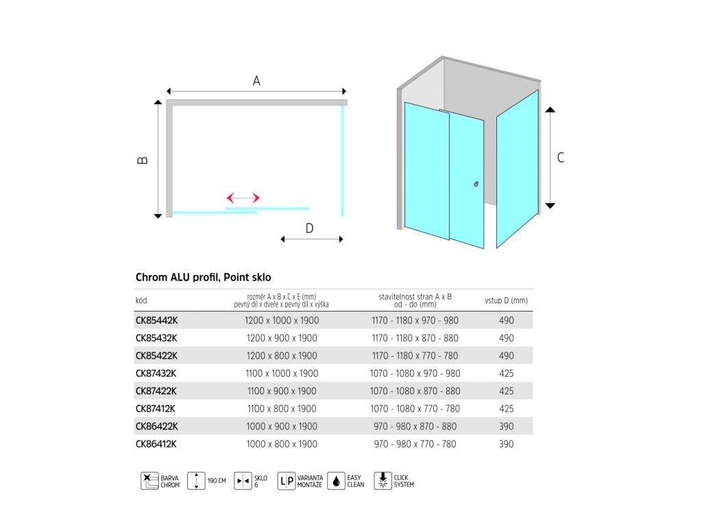 Hliníkové profily v barvě chrom, zasunovací dveře a pevný díl, sklo Point, síla skla 6 mm, obdélník, rozměr 1200 x 1000 mm, výška 1900 mm.