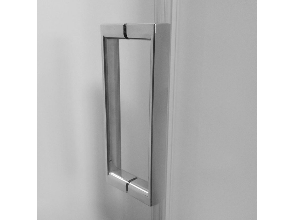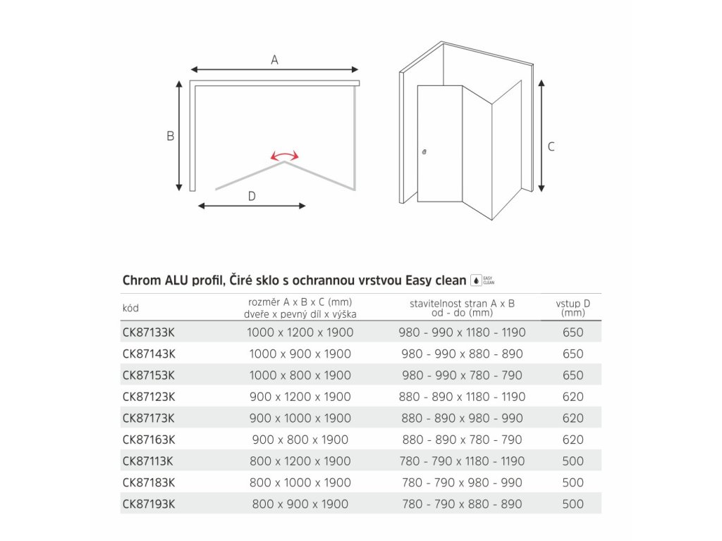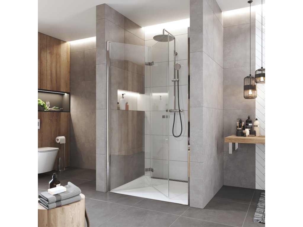 Hliníkové profily v barvě chrom, zalamovací dveře a pevný díl, sklo čiré, síla skla 6 mm, obdélník, rozměr 900 x 1000 mm, výška 1900 mm.