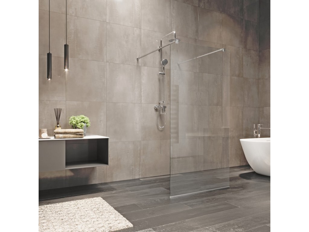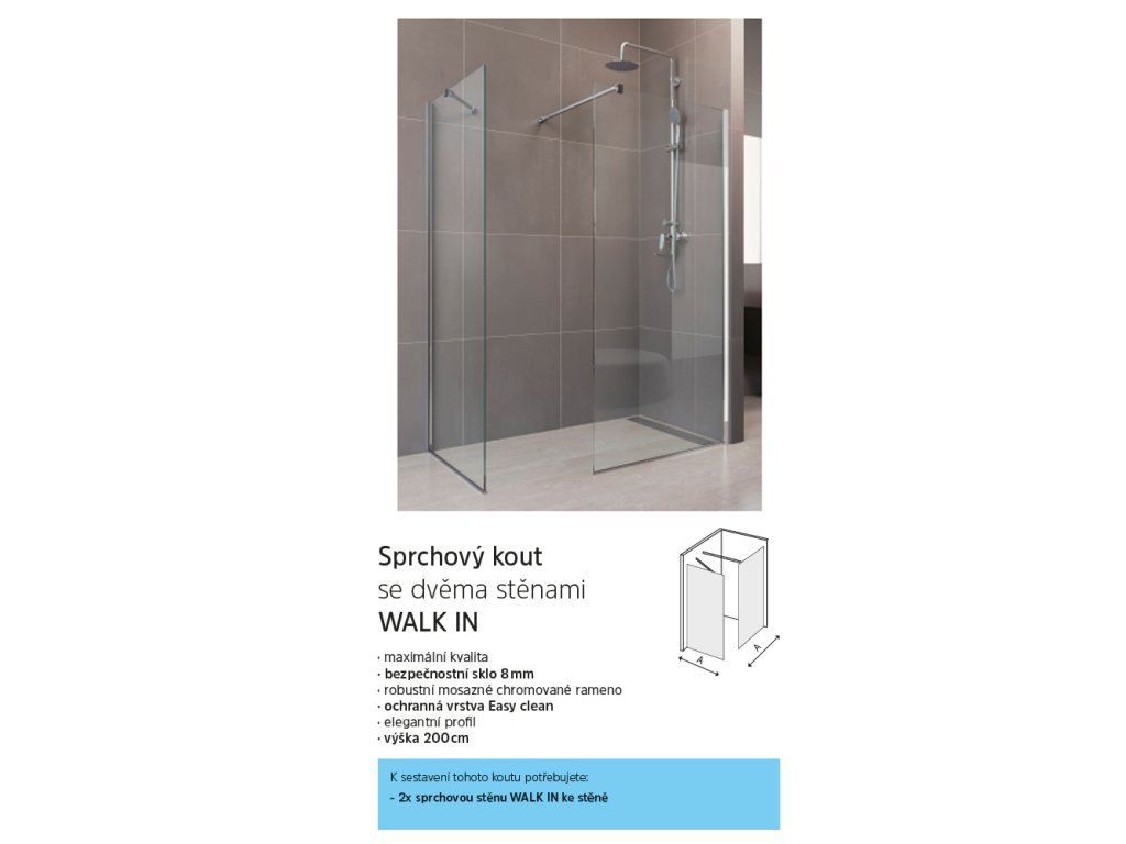 Sprchové stěny WALK IN jsou jediné, které se vám opravdu přizpůsobí. Sestavte si svůj sprchovací prostor na míru. Sprchový kout typu WALK IN si můžete poskládat v několika možných kombinacích. Stabilitu bezpečnostní skla zajišťuje elegantní kovová vzpěra a v případě montáže na zeď i boční stavitelný profil, které nenarušují designovou čistotu celého koutu, nejedná o hermeticky uzavřený výrobek.