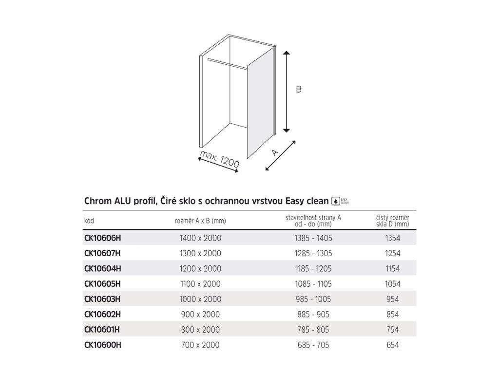 Hliníkové profily v barvě chrom, sklo Čiré, síla skla 8 mm, WALK IN, rozměr 1200 mm, výška 2000 mm.
