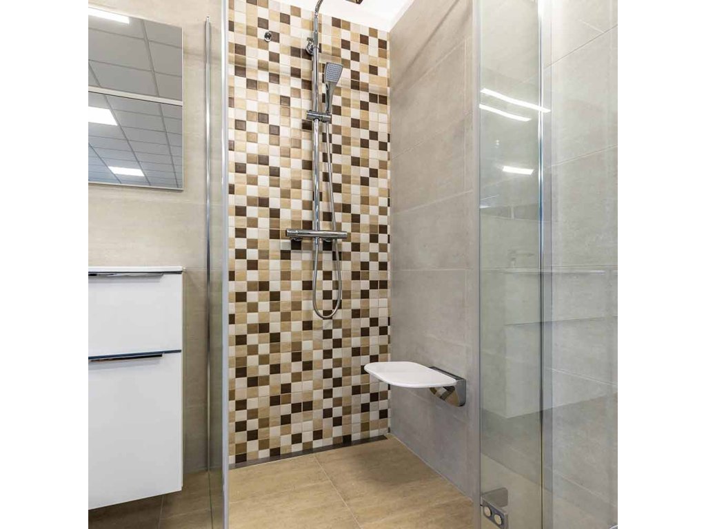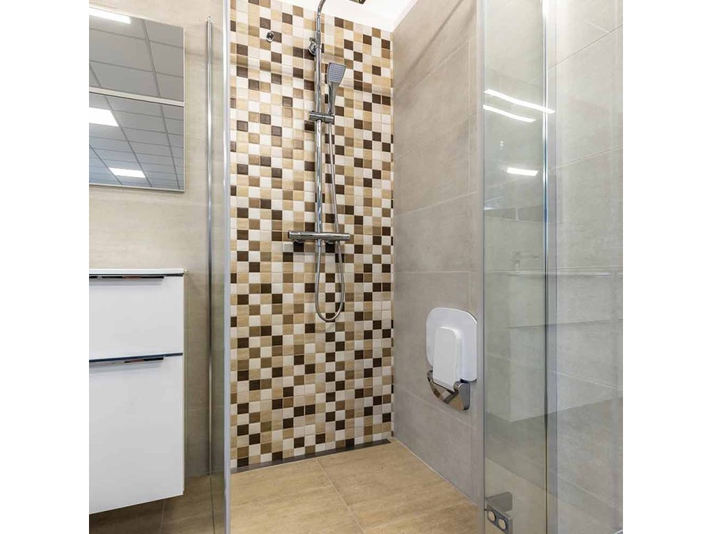 Sklopné sedátko do sprchového koutu. Sedací ergonomická část je vyrobena z duroplastu s protiskluzovou a antibakteriální úpravou. Ve sklopeném stavu sedátko zabere malý prostor, a proto je vhodné i do menších sprchových koutů.- duroplastové sedátko