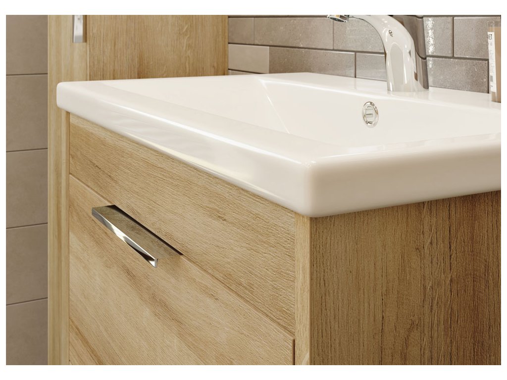 Série koupelnového nábytku Vigo umožňuje kombinovat skříňky do mnoha různých variant. Vytvořit tak lze jak složité kombinace do velkých koupelen, tak minimalistické řešení v moderním designu. Zásuvky jsou vybaveny designovými chromovanými úchytkami a značkovými pojezdy s pomalým dovíráním. Na výběr je ze dvou barevných kombinací, bílá lesk, dub Riviera. Skříňky mají laserové opracování hran a jsou dodávány smontované a všechny jsou určené k zavěšení.Nábytková keramická umyvadla s jedním otvorem pro stojánkovou baterii o tloušťce hrany 38 mm. S těmito umyvadly se splní Vaše požadavky na jednoduché a zároveň atraktivní vybavení koupelny za atraktivní ceny. Benefity těchto umyvadel jsou bezesporu funkčnost a líbivý vzhled. Umyvadlo je určeno pro nábytek.