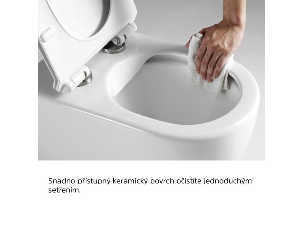 Díky novému tvaru mísy odpadá složité čištění splachovacího žlábku pod okrajem mísy, který je používaný na klasických klozetech, a kde by se mohly hromadit bakterie, špína a usazeniny.