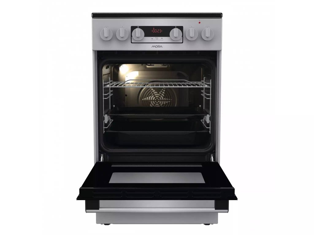 Elektrický sporák C 8678 BS v stříbrném provedení se sklokeramickou deskou a multifunkční troubou energeticky spadá do úsporné třídy A. Materiál použitý na varnou desku je tepelně odolný, snadno omyvatelný a vydrží zátěž až 100 kg a s ukazatelem zbytkového tepla na desce jste chráněni před nepříjemným popálením a jinými nehodami. Díky digitálnímu časovému spínači s hodinami se Vám již nikdy nespálí oběd, tato praktická funkce Vám přinese mnoho užitku. Lze nastavit odložený start a ukončení pečení, pouze ukončení pečení a minutka, samozřejmostí je nastavený aktuální čas. 70 l trouba je vybavená 11 pečicími programy, které jsou navržené přesně podle potřeb konkrétních jídel. Vykouzlíte například výbornou pizzu jako z italské restaurace (program Pizza), pomalu upečete pečínku a efektivně rozmrazíte hotové porce jídla. Pokud si rádi pochutnáváte na hranolkách nebo kuřecích nugetách, ale nedopřáváte si je tak často kvůli vysoké kalorické hodnotě, můžete také zkusit program pro horkovzdušné fritování bez tuku. Hotovky většinou volíme tehdy, když nás tlačí čas. Se speciálním programem pro hotová a mražená jídla ho ušetříte ještě víc, protože si připravíte chutný oběd rychleji, bez nutnosti předehřívání trouby. Výsledek však bude dokonalý, a tak si v klidu vychutnáte třeba kuřecí nugety, lasagne, hranolky nebo croissanty. Zvykli jste si, že předehřátí trouby trvá celou věčnost? Na to teď zapomeňte. Tato trouba se předehřeje na 200 ˚C do 5 minut, což je mnohem rychleji, než bývá zvykem. Nové bezpečné závěsy dvířek zaručují bez Vaší asistence velmi tiché a šetrné zavírání dvířek trouby. Pro zvýšení komfortu obsluhy je trouba vybavená teleskopickým výsuvem, které umožní bezpečnou manipulaci s připravovaným jídlem, aniž byste ho museli z trouby vytáhnout. Ve spodní části sporáku je praktický úložný prostor, do kterého snadno uložíte příslušenství v podobě roštu, mělkého plechu a MAXI pekáče XXL o objemu až 8 l. Perfektní vyčištění vnitřního prostoru po každém pečení zajistí funkce ECO CLEAN, díky které odstraníte i větší nečistoty bez nutnosti použít čisticí prostředek. Navíc je kryt ventilátoru vyroben ze speciálního katalytického smaltu absorbujícího mastnotu během pečení. Jakmile trouba dosáhne teploty 85 °C a více, katalytická vložka absorbuje mastnotu a vnitřek trouby zůstane krásně čistý.