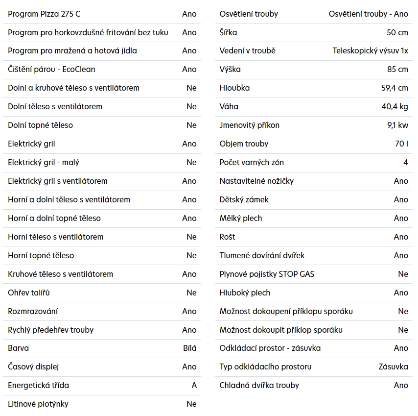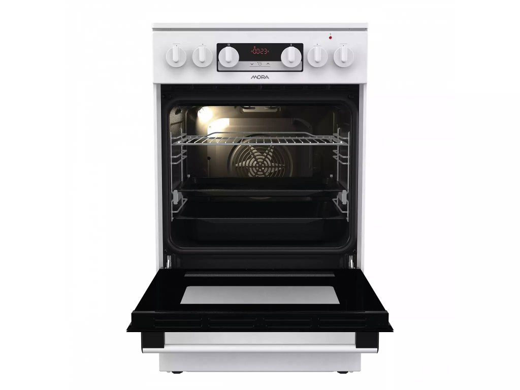Elektrický sporák C 8678 BW v klasickém bílém provedení se sklokeramickou deskou a multifunkční troubou energeticky spadá do úsporné třídy A. Materiál použitý na varnou desku je tepelně odolný, snadno omyvatelný a vydrží zátěž až 100 kg a s ukazatelem zbytkového tepla na desce jste chráněni před nepříjemným popálením a jinými nehodami. Díky digitálnímu časovému spínači s hodinami se Vám již nikdy nespálí oběd, tato praktická funkce Vám přinese mnoho užitku. Lze nastavit odložený start a ukončení pečení, pouze ukončení pečení a minutka, samozřejmostí je nastavený aktuální čas. 70 l trouba je vybavená 11 pečicími programy, které jsou navržené přesně podle potřeb konkrétních jídel. Vykouzlíte například výbornou pizzu jako z italské restaurace (program Pizza), pomalu upečete pečínku a efektivně rozmrazíte hotové porce jídla. Pokud si rádi pochutnáváte na hranolkách nebo kuřecích nugetách, ale nedopřáváte si je tak často kvůli vysoké kalorické hodnotě, můžete také zkusit program pro horkovzdušné fritování bez tuku. Hotovky většinou volíme tehdy, když nás tlačí čas. Se speciálním programem pro hotová a mražená jídla ho ušetříte ještě víc, protože si připravíte chutný oběd rychleji, bez nutnosti předehřívání trouby. Výsledek však bude dokonalý, a tak si v klidu vychutnáte třeba kuřecí nugety, lasagne, hranolky nebo croissanty. Zvykli jste si, že předehřátí trouby trvá celou věčnost? Na to teď zapomeňte. Tato trouba se předehřeje na 200 ˚C do 5 minut, což je mnohem rychleji, než bývá zvykem. Nové bezpečné závěsy dvířek zaručují bez Vaší asistence velmi tiché a šetrné zavírání dvířek trouby. Pro zvýšení komfortu obsluhy je trouba vybavená teleskopickým výsuvem, které umožní bezpečnou manipulaci s připravovaným jídlem, aniž byste ho museli z trouby vytáhnout. Ve spodní části sporáku je praktický úložný prostor, do kterého snadno uložíte příslušenství v podobě roštu, mělkého plechu a MAXI pekáče XXL o objemu až 8 l. Perfektní vyčištění vnitřního prostoru po každém pečení zajistí funkce ECO CLEAN, díky které odstraníte i větší nečistoty bez nutnosti použít čisticí prostředek. Navíc je kryt ventilátoru vyroben ze speciálního katalytického smaltu absorbujícího mastnotu během pečení. Jakmile trouba dosáhne teploty 85 °C a více, katalytická vložka absorbuje mastnotu a vnitřek trouby zůstane krásně čistý.