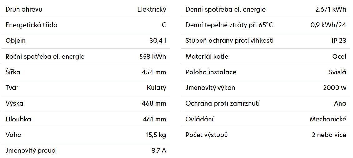 Klasický ohřívač vody MORA kulatého tvaru je vybaven termostatem a objemem 30 litrů. Je určený k zásobování jednotlivých nebo více odběrových míst. Instaluje se velmi jednoduše ve vertikální poloze. Teplotu si regulujete sami moderním termostatem, též je možné nastavit hospodárnou variantu a také ochranu proti zamrznutí. Bojler obsahuje kontrolku topného tělesa, bimetalový teploměr, ukazatel teploty vody v zásobníku bojleru. Je vyroben ze speciálního smaltu s hořčíkovou anodou. Údržba je velmi příjemná a jednoduchá.