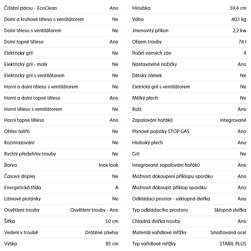 - rozměry spotřebiče (v x š x h): 85 x 50 x 59,4 cm
