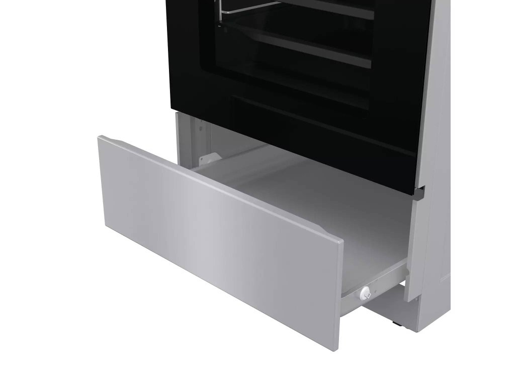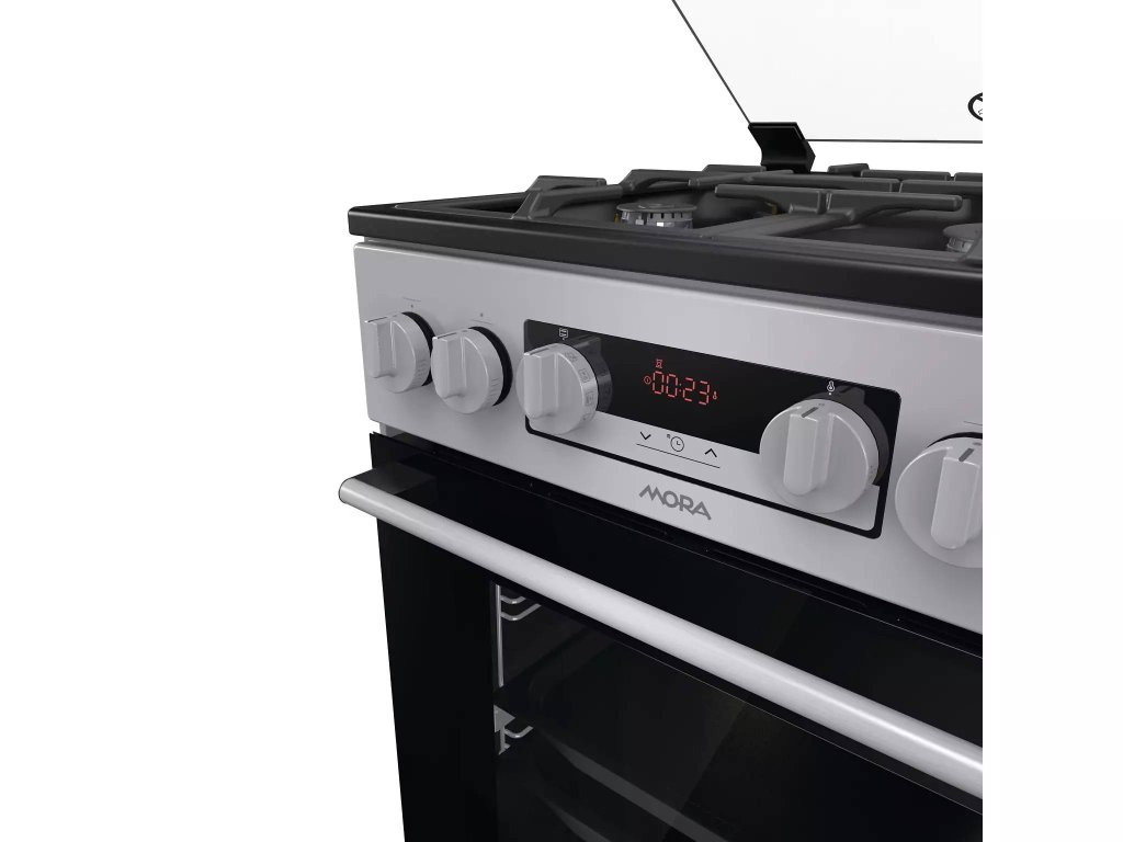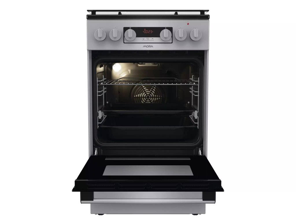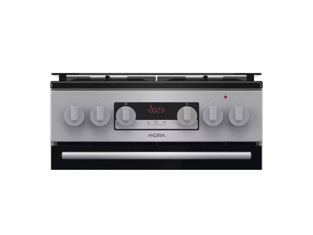 Kombinovaný sporák Mora K 8668 BS v provedení INOX Look s multifunkční troubou v objemu 70 l Vás překvapí energeticky úspornou třídou A. Plynové hořáky s pojistkami STOP GAS a integrovaným zapalováním jsou kryté dvoudílnou mřížkou STABIL PLUS, která zajišťuje bezpečný posun nádobí ve všech směrech. Díky digitálnímu časovému spínači s hodinami se Vám již nikdy nespálí oběd, tato praktická funkce Vám přinese mnoho užitku. Lze nastavit odložený start a ukončení pečení, pouze ukončení pečení a minutka, samozřejmostí je nastavený aktuální čas. Disponuje funkcí páry, kterou ocení především příznivci zdravé výživy. Připravíte s ní jídla rychle a šetrně, takže si zachovají maximum vitamínů a stopových prvků. Dále je trouba vybavená 11 pečicími programy, které jsou navržené přesně podle potřeb konkrétních jídel. Vykouzlíte například výbornou pizzu jako z italské restaurace (program Pizza), pomalu upečete pečínku a efektivně rozmrazíte hotové porce jídla. Pokud si rádi pochutnáváte na hranolkách nebo kuřecích nugetách, ale nedopřáváte si je tak často kvůli vysoké kalorické hodnotě, můžete také zkusit program pro horkovzdušné fritování bez tuku. Hotovky většinou volíme tehdy, když nás tlačí čas. Se speciálním programem pro hotová a mražená jídla ho ušetříte ještě víc, protože si připravíte chutný oběd rychleji, bez nutnosti předehřívání trouby. Výsledek však bude dokonalý, a tak si v klidu vychutnáte třeba kuřecí nugety, lasagne, hranolky nebo croissanty. Zvykli jste si, že předehřátí trouby trvá celou věčnost? Na to teď zapomeňte. Tato trouba se předehřeje na 200 ˚C do 5 minut, což je mnohem rychleji, než bývá zvykem. Nové bezpečné závěsy dvířek zaručují bez Vaší asistence velmi tiché a šetrné zavírání dvířek trouby. Pro zvýšení komfortu obsluhy je trouba vybavená teleskopickým výsuvem, které umožní bezpečnou manipulaci s připravovaným jídlem, aniž byste ho museli z trouby vytáhnout. Ve spodní části sporáku je praktický úložný prostor, do kterého snadno uložíte příslušenství v podobě roštu, mělkého plechu a MAXI pekáče XXL o objemu až 8 l. Perfektní vyčištění vnitřního prostoru po každém pečení zajistí funkce ECO CLEAN, díky které odstraníte i větší nečistoty bez nutnosti použít čisticí prostředek.