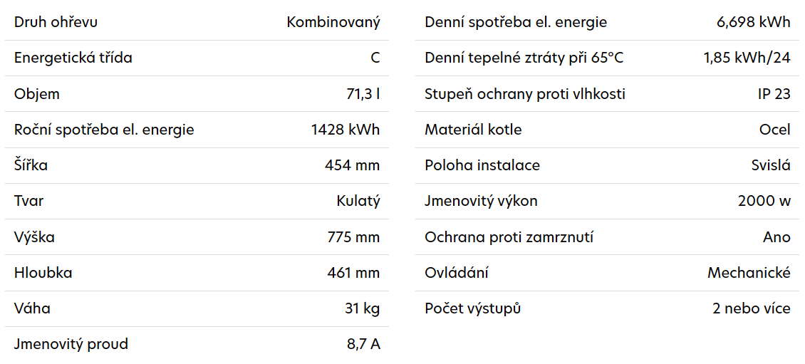 Kombinovaný elektrický bojler od tradiční české značky MORA kulatého tvaru s objemem 80 litrů. Je určen k zásobování jednotlivých nebo více odběrových míst. Instalace je velmi jednoduchá a svislá. Bojler je osazený dodatečným tepelným výměníkem a umožňuje provoz v kombinaci se systémem ústředního vytápění. Přípojka tepelného výměníku zprava. Teplotu si regulujete sami pomocí otočného termostatu. Ohřívač je vybaven kontrolkou topného tělesa, bimetalovým teploměrem a ukazuje teplotu vody v zásobníku. Vyroben ze speciálního smaltu s hořčíkovou anodou. Údržba je velmi praktická a bezproblémová.