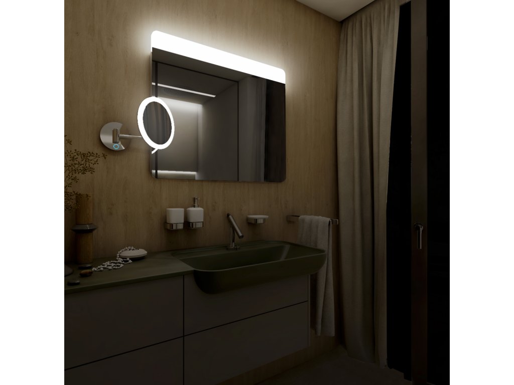 Nová technologie svícení za použití akrylátového skla – plexiglass. Konstrukce je z hliníkového rámu 32x19 mm, sklo zrcadla o tloušťce 5mm. Připojení 220-240 V. Zapínání / vypínání / ovládání dotykovým senzorem s pamětí. Možnost nastavení barevné teploty svícení. Životnost LED diod je až 50 000 hodin. Ochrana IP 44.