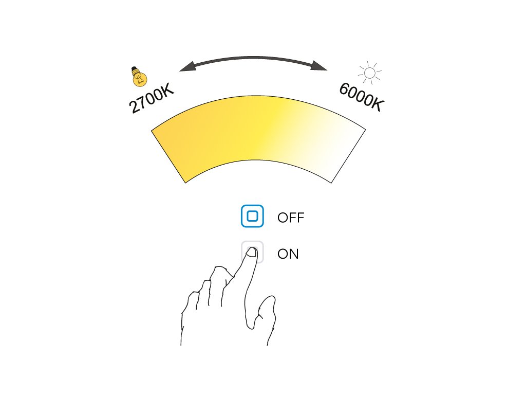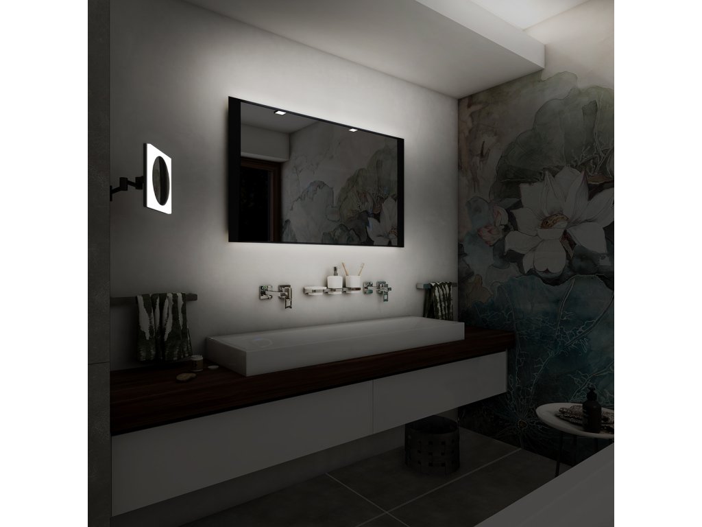 Zrcadlo o tloušťce 5 mm je zapuštěné do masivního černého matného rámu. Rám zrcadla je z hliníku. LED pásky jsou zabudované v liště z akrylového skla. Akrylové sklo lépe rozptyluje světlo a chrání Led diody před vlhkostí. Lišta je umístěna za rámem zrcadla. Světlo vychází do prostoru za zrcadlem a vytváří tak zajímavé ambientní svícení. Zapínání / vypínání / ovládání je pomocí dotykového senzoru s pamětí. Možnost nastavení barevné teploty svícení od studené bílé až po teplou bílou.