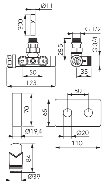 - integrovaný úhlový ventil s přednastavením a 1/2" radiátorovou přípojkou